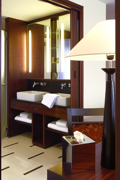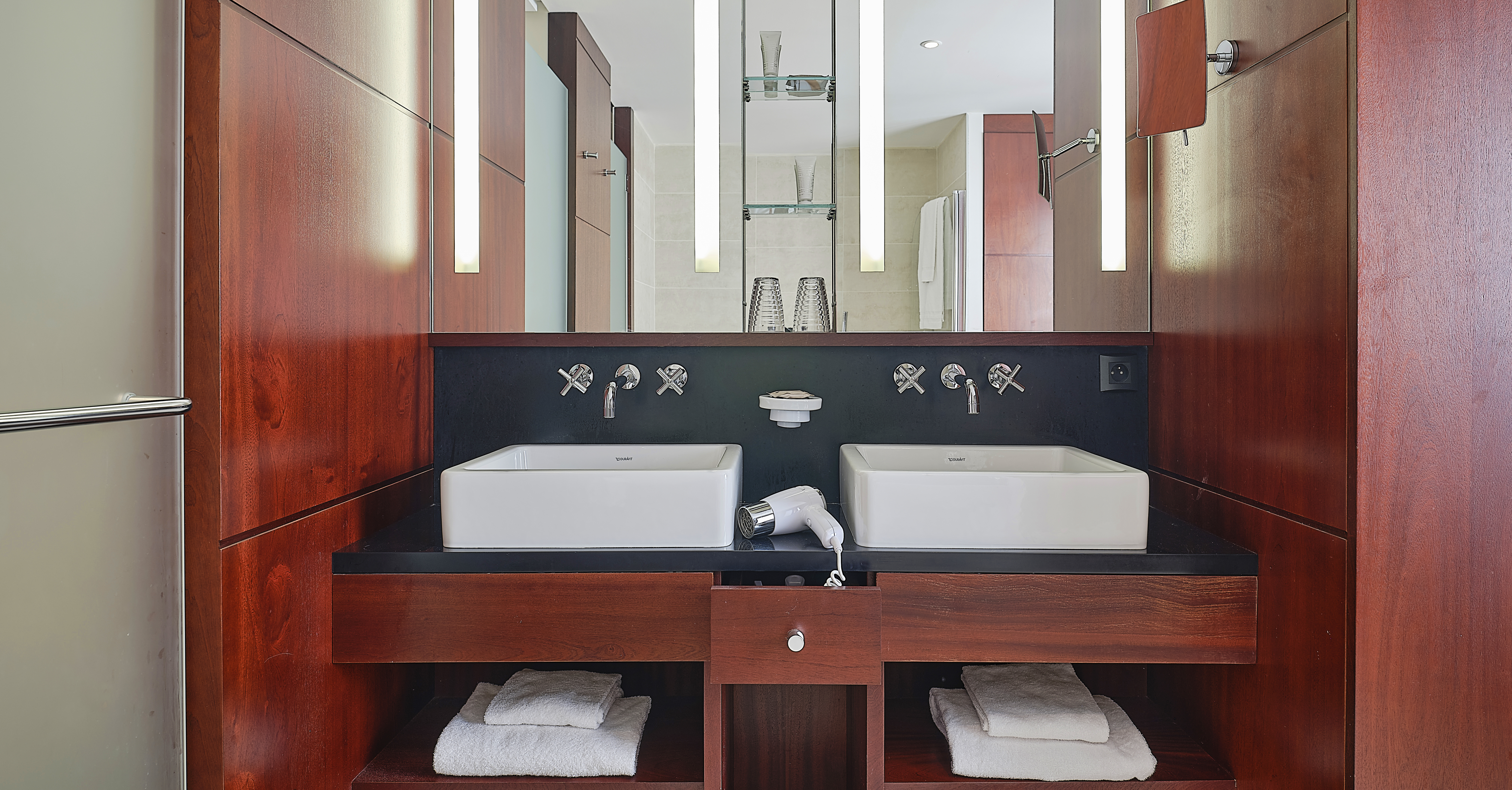 La salle de bain est équipée d’une douche à l’italienne, de deux grandes vasques et d’un WC.